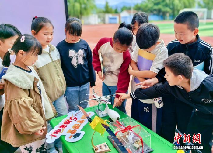 科学课堂上,学生们观看航空遥感飞机、“极目一号”浮空器等模型