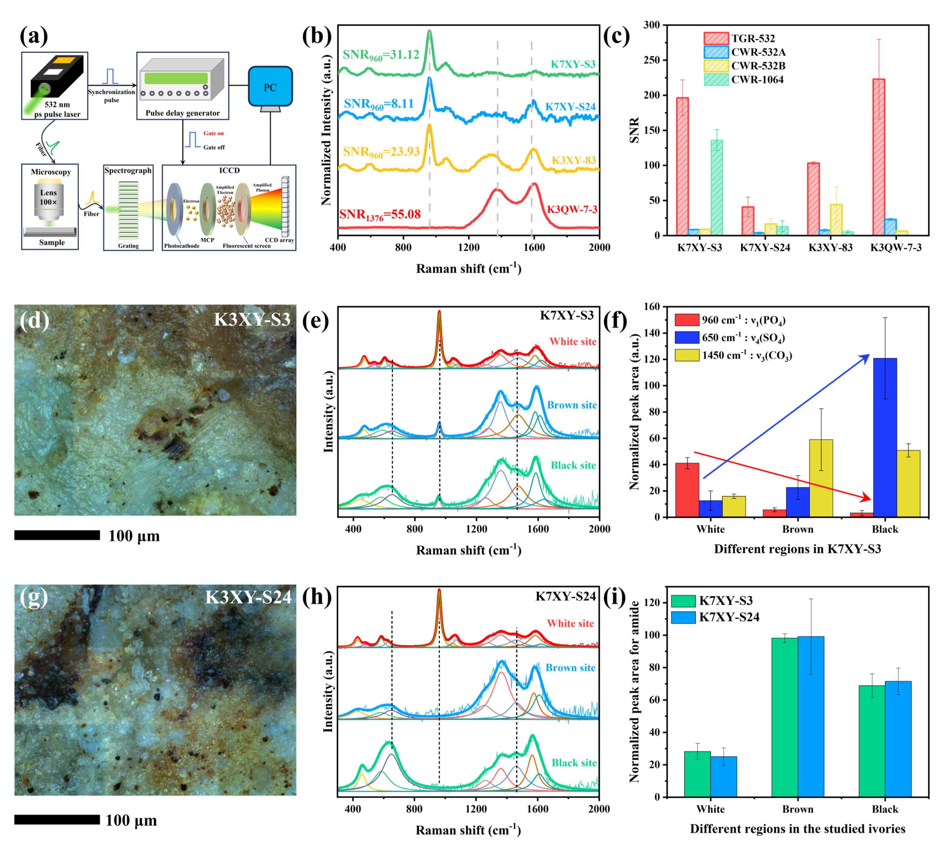 研究显示,四块象牙碎片的荧光强度差异显著,其中两块在传统连续光拉曼条件下几乎无法得到有效信号。而在时间门控拉曼检测中,荧光干扰被有效抑制,强荧光样品的拉曼信噪比提升超过20倍,象牙内部成分差异清晰显现。分析表明,不同埋藏环境的象牙在有机质含量、骨架结晶性和腐蚀程度上存在明显差异;金属离子侵入及硫酸根等非金属离子替代羟基磷灰石,是导致象牙深度老化的主要原因,部分样品还可能经历过焚烧等人为破坏。