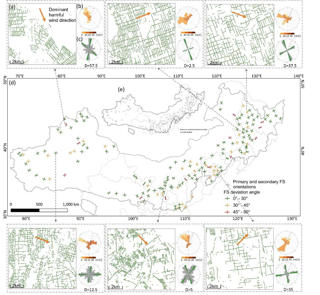 图3 (a) 该区域农田防护林网细节图。(b) 该气象站的起沙风风玫瑰图。(c) 区域内防护林走向的频率分布,其中主林带和副林带走向以绿色标注