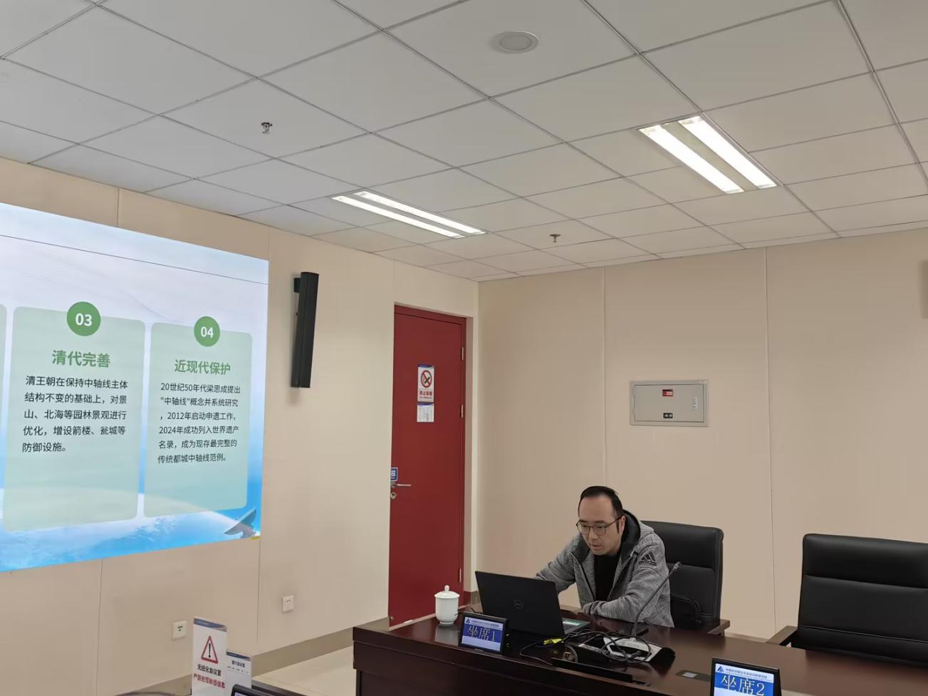 首期领学人为办公室冯丹,深入介绍了北京中轴线的历史沿革,展现北京中轴线上遗产构成要素,见证北京城市的变迁与发展。其中,重点学习了中轴线申遗成功的重大意义,解读联合国教科文组织对中轴线的评价,从而深刻领会中轴线作为中国理想都城秩序杰作的重要地位,增强文化自信与历史责任感。
