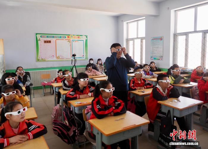 科学课堂上,学生们佩戴3D眼镜观察嫦娥四号-玉兔二号月球车拍摄的环形山