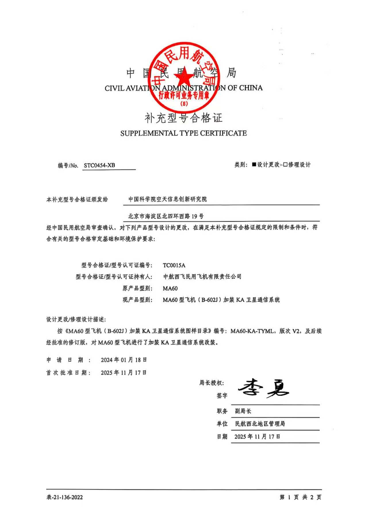 11月17日,中国科学院空天信息创新研究院(空天院)航空遥感中心申请的MA60型飞机(B-602J)加装Ka卫星通信系统补充型号合格证(STC)获中国民航西北地区管理局适航批准,系空天院作为持证人获得的第6张STC证书。该系统主要依托中星16号地球同步轨道卫星,并兼容后续中星系列Ka频段高通量卫星,构建Ka频段宽带卫星通信链路,可为用户提供基于IP的高速数据传输服务。