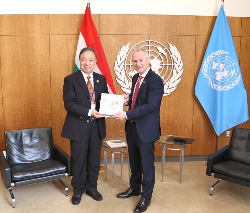SDG中心主任郭华东院士(左)向联大主席克勒希赠送数据产品。 SDG中心 供图