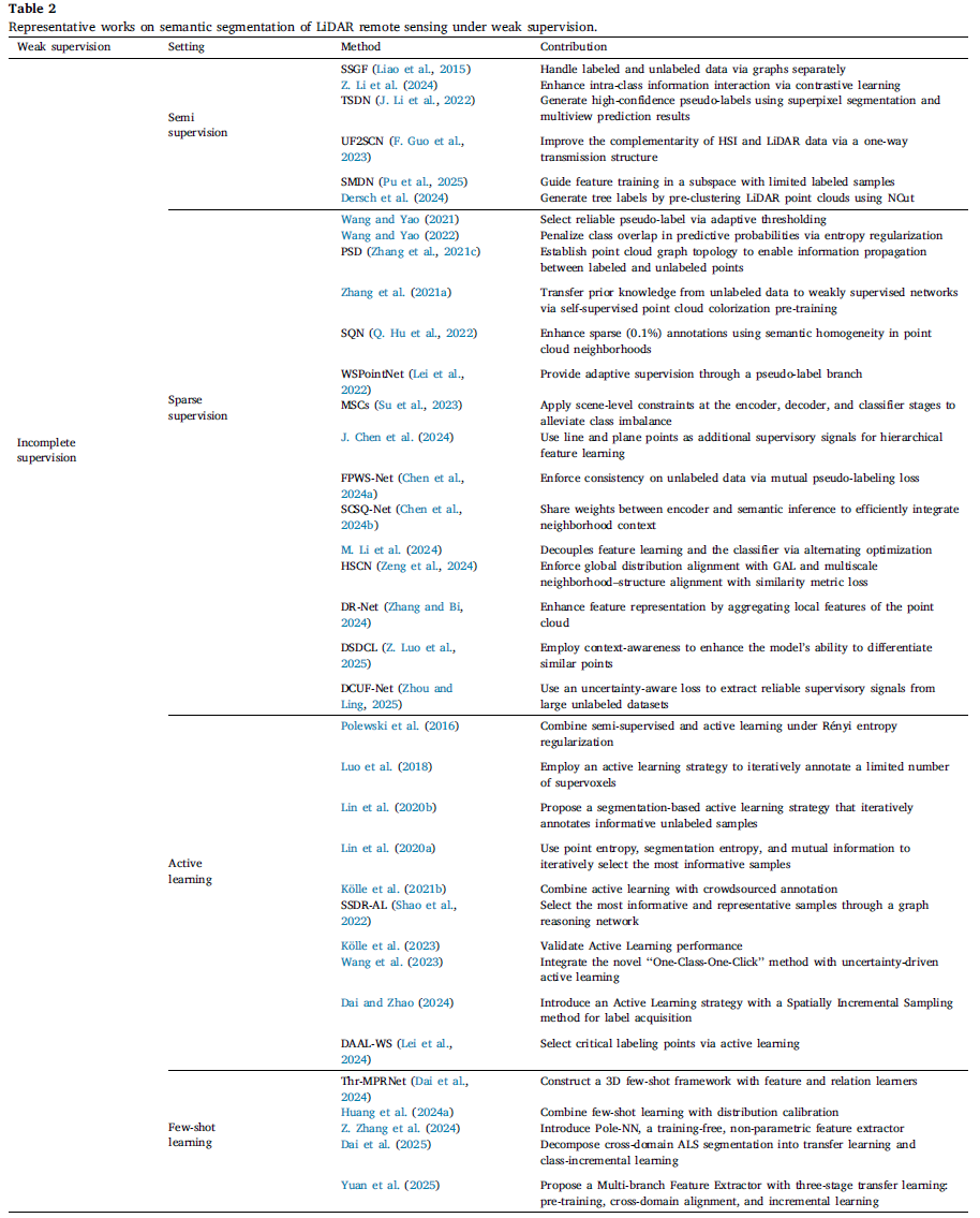 在LiDAR数据解译方面,研究团队全面回顾了在广义弱监督视角下利用有限或不完美标签下提取点云几何与语义信息的技术路径,将其粗略划分为四个研究方向: