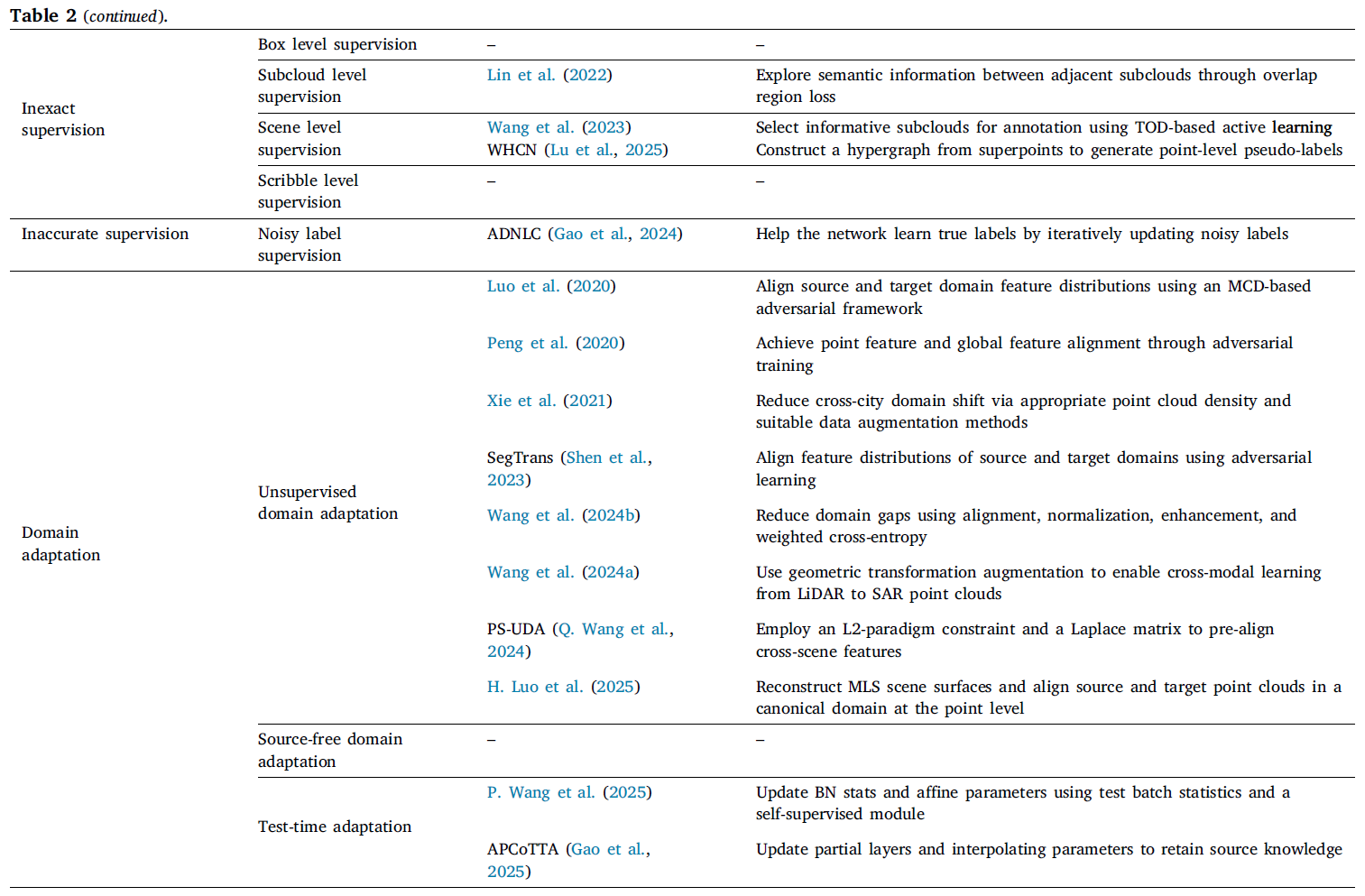 一是不完全监督,利用极少量精确标注和海量无标签数据,涵盖了半监督学习中的伪标签与一致性正则化、稀疏监督、主动学习以及小样本学习。二是不确切监督,利用粗粒度的包围框、场景级标签或涂鸦标签来替代逐点精确标注,从而大幅降低标注成本。三是不准确监督,应对包含错误或噪声的标签数据,通过置信度过滤、多视角投票和噪声自适应校正等方法提升模型的鲁棒性。四是跨域自适应与泛化,核心目标是在标注稀缺或不可获取的条件下,实现模型在不同场景间的有效迁移。该方向主要面向跨传感器平台、跨地区以及跨季节等复杂分布差异带来的迁移难题,涵盖无监督领域自适应、无源领域自适应、测试时自适应以及更为严苛的领域泛化等技术路径。
