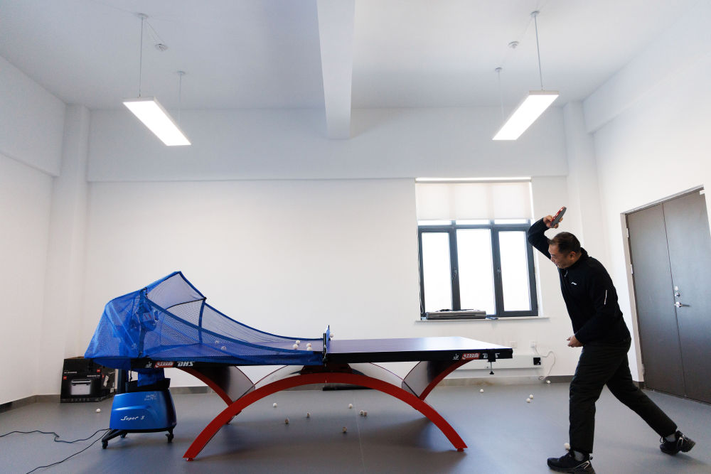 1月25日,漠河站站长施胜浦在活动室打乒乓球。活动室配备了发球机,方便站里只有一人值守时活动。